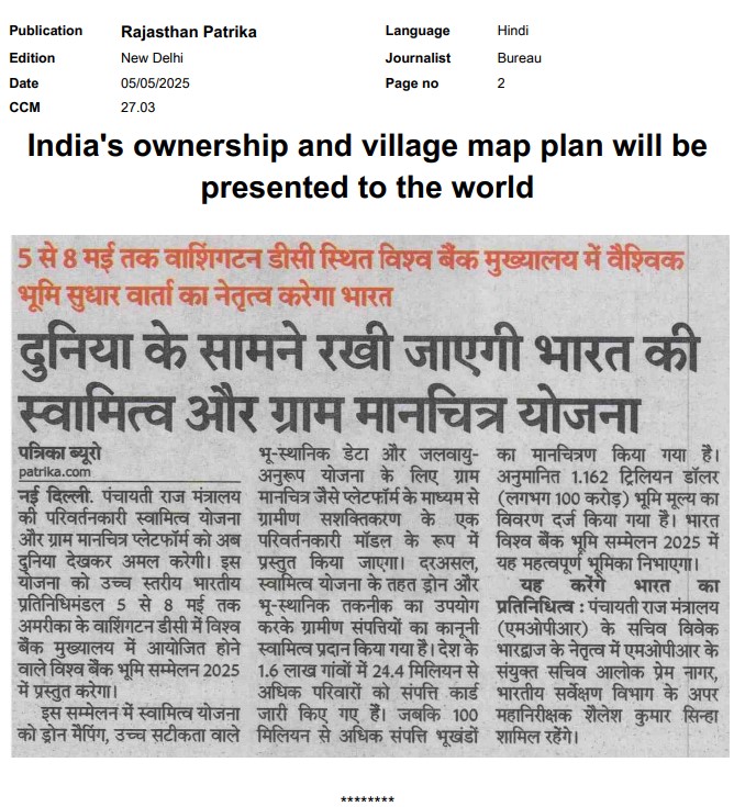 भारत की स्वामित्व एवं ग्राम मानचित्र योजना विश्व के समक्ष प्रस्तुत की जाएगी ( राजस्थान पत्रिका)